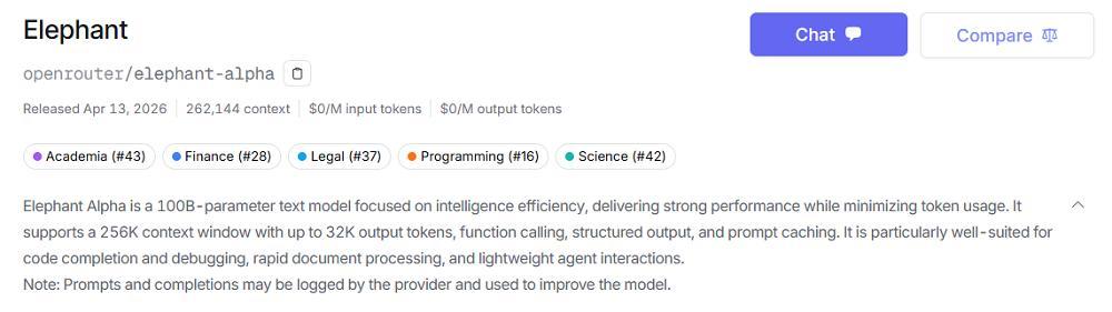 根据OpenRouter对其介绍,Elephant是一个100B参数量的纯文本模型,主打高token效率,支持256k上下文和32k输出,适合的任务包括代码补全、调试、快速文档处理和轻量级Agent交互等等。