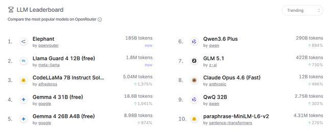 智东西4月16日报道,这两天,一款名为Elephant(大象)的匿名模型,在OpenRouter上悄然亮相。上线不到48小时,这一模型已经冲到OpenRouter热榜(Trending)第一,目前调用量超过1850亿个token。